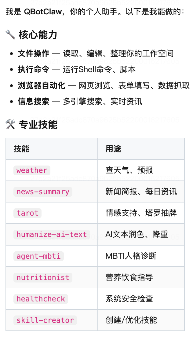 智东西上手快速体验了QBotClaw,首先询问它能做什么,QBotClaw罗列了8个专业技能,并提到其拥有文件操作、执行命令、浏览器自动化、信息搜索4大能力。